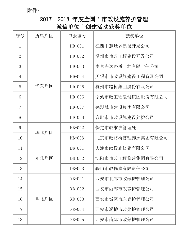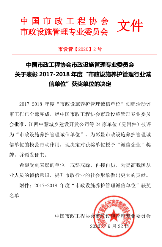 近日,經(jīng)過(guò)中國(guó)市政工程協(xié)會(huì)市政設(shè)施管理專(zhuān)業(yè)委員會(huì)評(píng)選,漢陽(yáng)市政首次榮獲2017-2018年度“市政設(shè)施養(yǎng)護(hù)管理誠(chéng)信單位”,彰顯了公司在市政管養(yǎng)領(lǐng)域的模范帶頭作用。