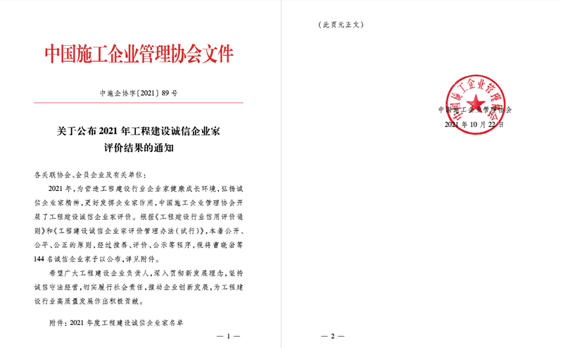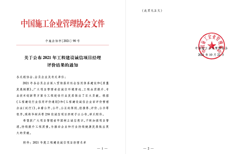 近日,中國施工企業管理協會傳來好消息,漢陽市政黨委書記、董事長嚴悌文榮獲“2021年工程建設誠信企業家”,漢陽市政七公司總工程師羅艷明榮獲“2021年工程建設誠信項目經理”。