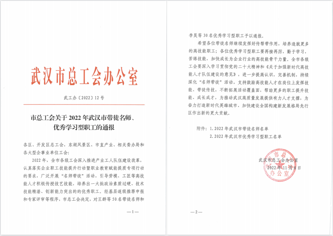 師徒結對傳匠心,青藍相接鑄輝煌。2022年11月8日,根據武漢市總工會辦公室發(fā)布的《市總工會關于2022年武漢市帶徒名師、優(yōu)秀學習型職工的通報》,漢陽市政羅明飛、李子豪、陳文獲評“武漢市帶徒名師”,林志剛、易曉輝獲評“武漢市優(yōu)秀學習型職工”。