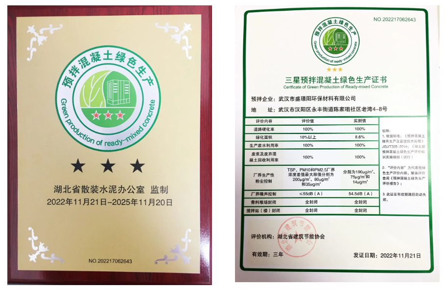 ? ? 近日,喜報(bào)傳來,漢陽市政盛璟陽公司順利通過評審程序,相繼取得了“三星預(yù)拌混凝土綠色生產(chǎn)評價(jià)證書”及“綠色建材三星認(rèn)證證書”,成為一家榮獲“綠色生產(chǎn)+綠色建材”雙三星認(rèn)證企業(yè)。