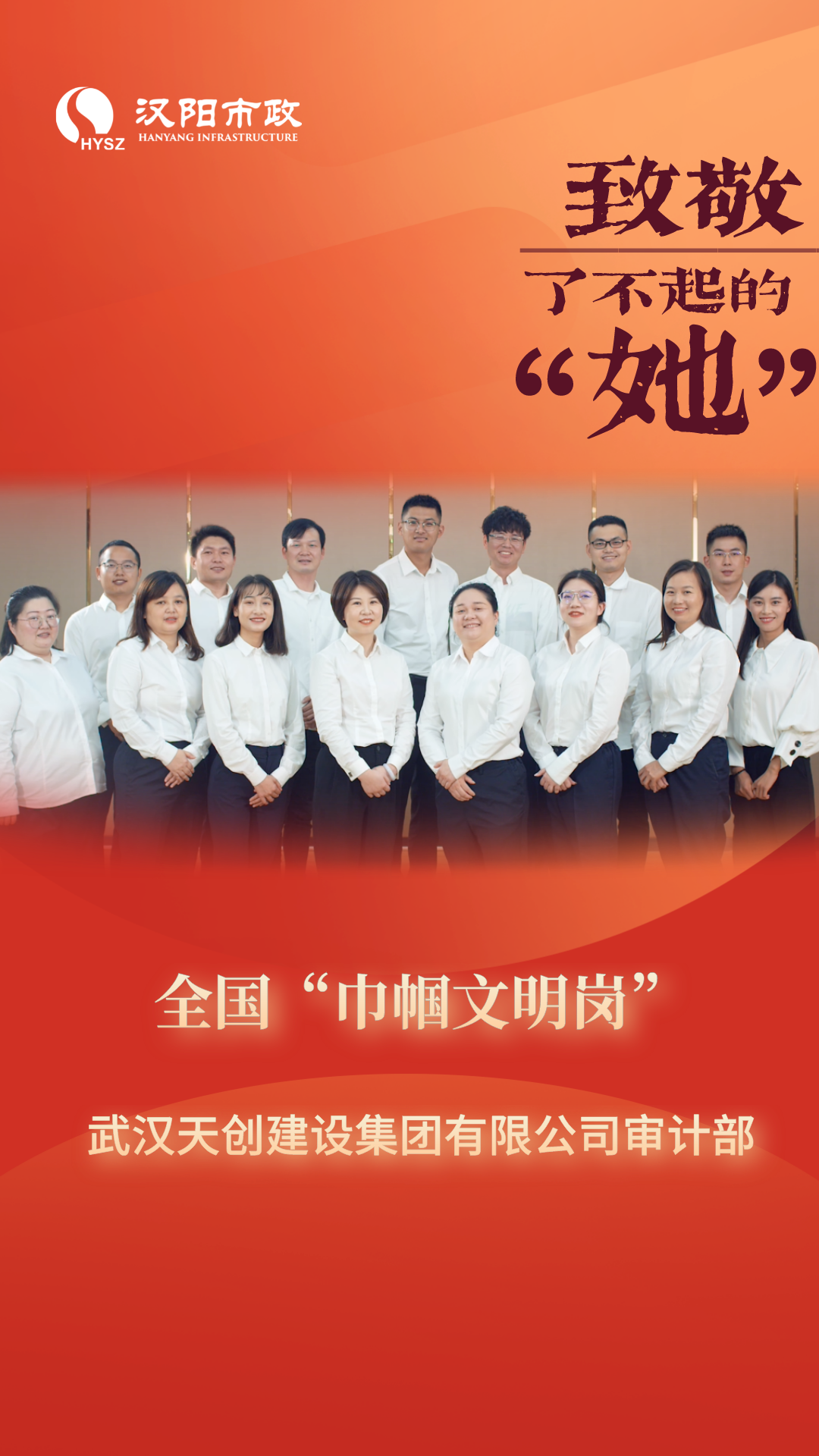 ? ? 近日,捷報頻傳!從全國婦聯(lián)、省婦聯(lián)、武漢市婦聯(lián)獲悉,漢陽市政天創(chuàng)建設(shè)公司審計部獲評“全國巾幗文明崗”榮譽稱號,漢陽市政集團工程部副部長羅惠敏獲評湖北省“巾幗建功標兵”榮譽稱號,設(shè)計公司副總經(jīng)理韓梅獲評2022年度武漢市“新時代巾幗英雄”榮譽稱號!今天,讓我們一覽她們的巾幗風采,“建”證她們的巾幗力量!