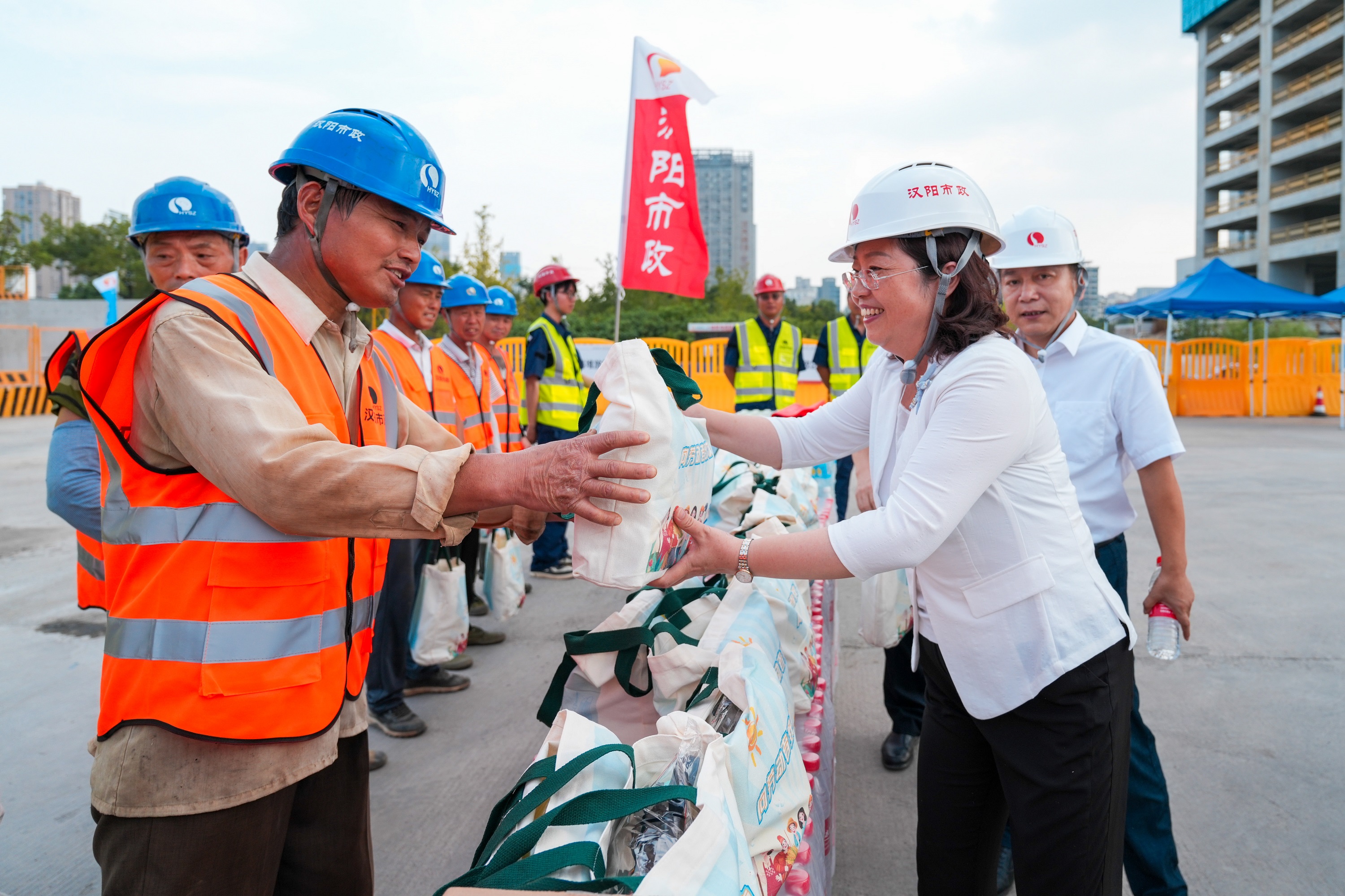 8月18日下午,武漢市總工會黨組書記、常務副主席王芳,經濟技術和勞動保護部部長趙林松,漢陽區總工會黨組書記、常務副主席李鐘,副主席陳新樹一行來到漢江南岸項目開展高溫慰問活動,為高溫下堅守一線的建設者們送去了礦泉水、鹽汽水、藿香正氣水等防暑降溫物資。漢陽市政黨委書記、董事長嚴悌文,黨委副書記、紀委書記冷雪陪同慰問。