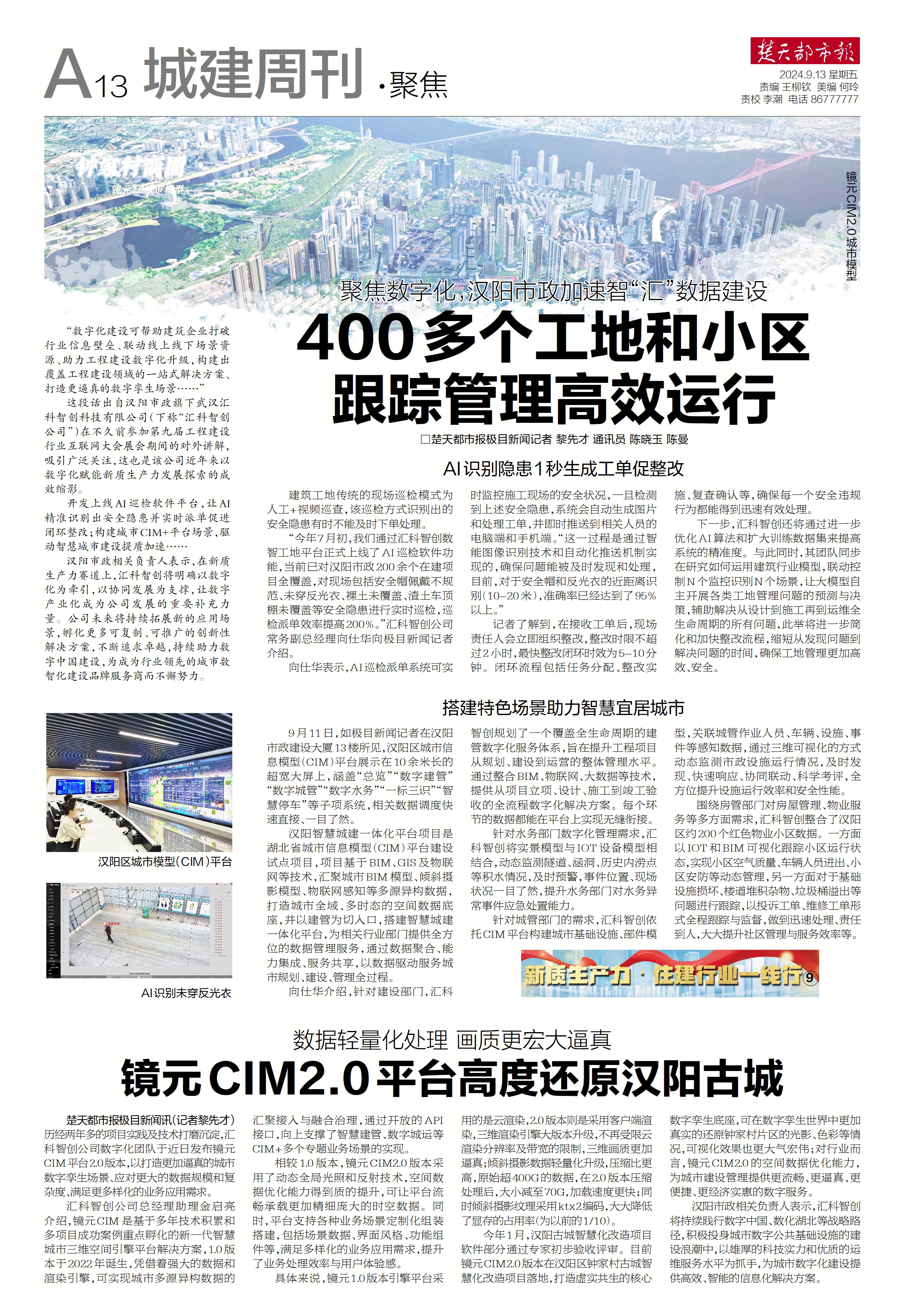? ? 楚天都市報推出《聚焦數字化,漢陽市政加速智“匯”數據建設,400多個工地和小區(qū)跟蹤管理高效運行》專版報道。
